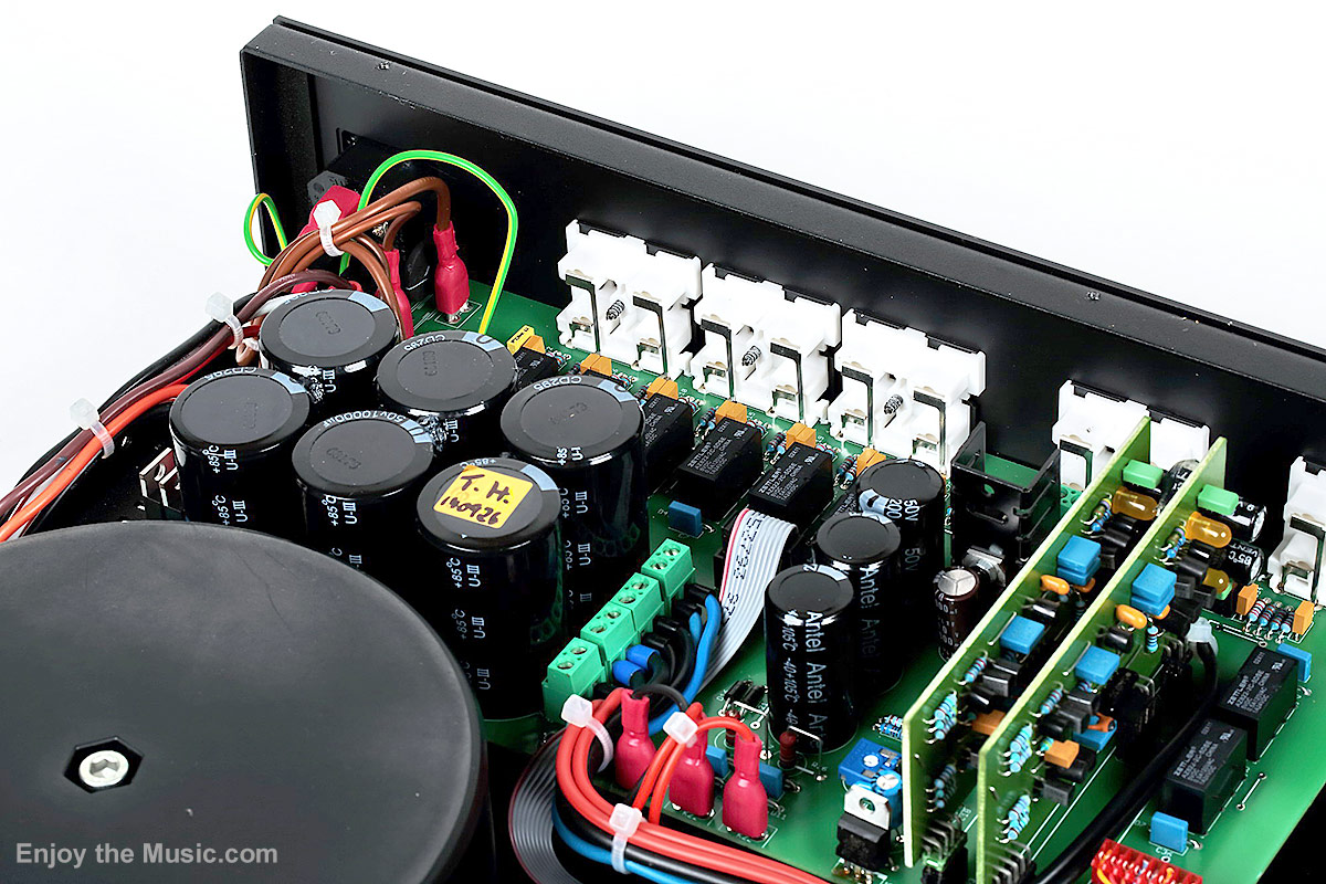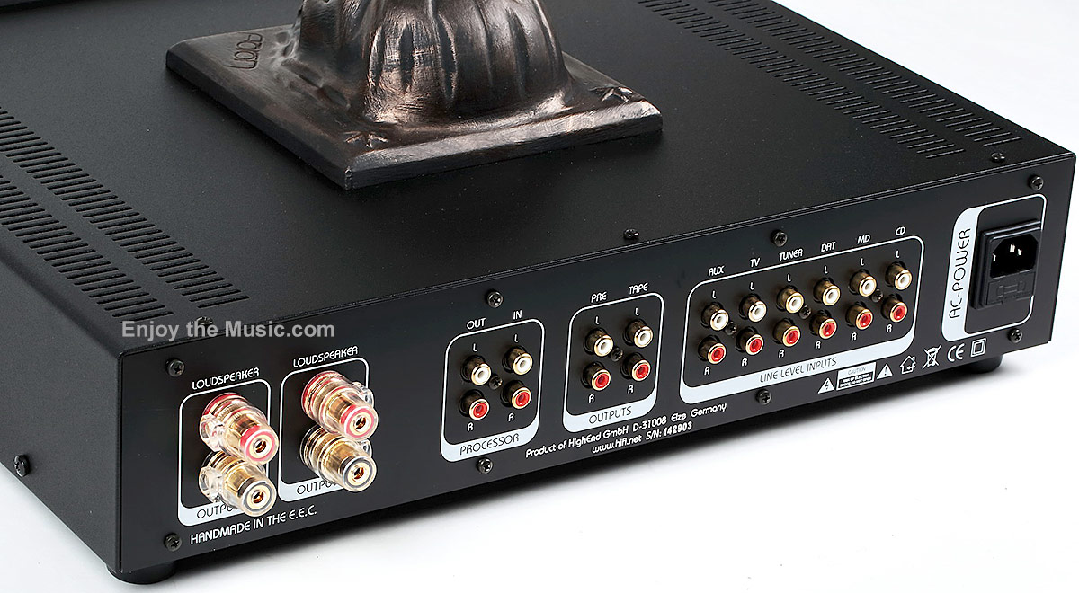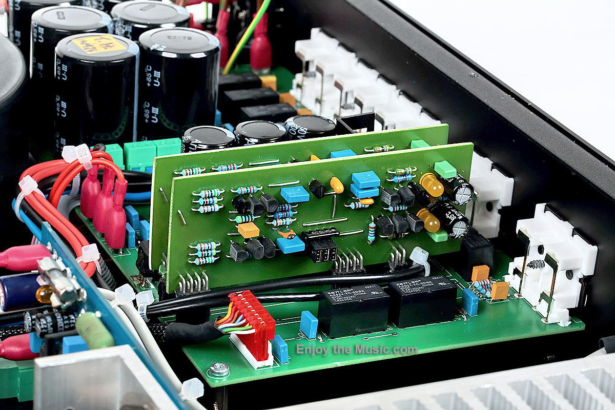 Design The amplifier is equipped with an absolutely classic, though extensive, set of inputs and outputs. It accepts a line level signal, which can be fed to six RCA input connectors on the back panel, plus it has a preamplifier output and tape loop as well as external processor input and output. Speaker binding posts are a very high quality gold-plated affair. There is also an IEC inlet with fuse. There is no audio "jewelry" to speak about per se as the unit itself is solid, though provides absolutely essential connectors. This pragmatic approach is also manifests itself within the manufacturer's choice of isolation feet, which are plastic bottle corks. Internally, the amplifier has a modular design. Mounted near the rear panel is a large circuit board with a power supply and two preamplifier daughterboards, one per channel, plugged in vertically to the motherboard. The preamplifier circuit is based on matched pairs of bipolar transistors. Volume control is carried out in a 64-step integrated ladder with laser-cut resistors (DS1808-050). The input selection is performed via relays. The same type of relays connect or disconnect the preamplifier and power amplifier sections. The signal is fed to the power amplifiers via