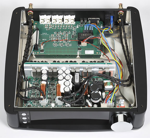 The I-180 is a soloist and designed exclusively for the playback of analog high-level sources, and this also exclusively via RCA. On the one hand, the price is reduced thus, because you only pay for what you want – in this case, a cleanly designed, state-of-the-art integrated amplifier. It on the other hand ensures that the special requirements posed by a built-in DAC or phono section can be ignored for the time being. The drawback of this concept: an increase in the required space if you want to integrate e.g. a D/A converter into your setup. If such a system is on your wish list, try to have the "U" series of the Danes presented to you – a DAC is integrated into the otherwise identical amplifier technology there. The developers around Michael Børresen have built this series in a genuinely innovative way, not only choosing what to their ears is the best Class D module from Pacsal – but also placing an unusually high emphasis on the mechanical side. This is manifested in both shape and choice of materials for the devices. Without any problem, the Class D module provides around 300 watts per channel and is unusually broadband for a Class D amp. Thanks to a clever negative feedback circuit that is only used in the first stage of amplification, it is also fairly insensitive to impedance fluctuations of speakers. Another trick in the circuit design ensures that the amplifier can draw on additional current reserves if necessary. The fact that the Danish box also keeps speakers under control with an iron grip was furthermore proven by its performance in our lab. There, the results of all the other measurements also made it clear that this device was developed by someone who has long since let his craft mature into a form of art.