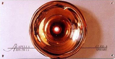 The Horn Midrange I have a confession to make. I was not really a horn speaker fan until I heard horns via Acapella. I truly appreciate the dynamics of horns, and dynamics are one of the hardest characteristics of live music for a hi-fi system to reproduce. I also appreciate how the higher sensitivity of a horn system allows them to be used with smaller wattage and usually simpler circuit amplifiers, and thus a theoretically less altered signal to pass through. However, many horn speaker designs roll off the high frequencies too quickly for my personal taste. The mating of the horn midrange to the Plasma Ion Tweeter is the remedy for my horn issues, proving a well executed design can result in so much more than just the sum of its parts. The beautifully flared horn may share its roots with its predecessors, but unlike the surviving vintage speakers I have heard, there was no metallic ringing flares requiring copious amounts of "soundcoat", or subtle, but once identified annoying wooden resonances, just pure clean and big sound. All of it was there, effortless dynamics, the open soundstage, big, open and airy sounding music. Throw on a smoky voiced female singer and be intoxicated by their performance. You can hear them breathe between lyrics when the recording is up to it. Jacintha's rendition of "Georgia On My Mind" from Here's to Ben (FIM XRCD 020) portrayed the sensual vocals and sax with a breathtaking balance of hearing every detail and breath of the original note and lyric, combined with the delicate decay of those same notes and lyrics. Domnerius playing Antiphone Blues (FIM CD003) filled the room with luscious sounds, what a wonderful front soundstage and all around soundscape!
