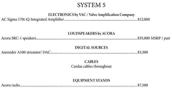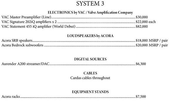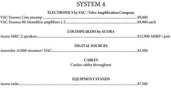 The one-two combination of VAC and Acora Acoustics is a match made in hi-fi heaven. Enjoy your fave tunes as the immersive soundscape seems to naturally flow and envelope the listen (as appropriate within the source material / music). Fast, clean, yet hints of wonderful warmth and seductiveness (when appropriate / female vocals), or laser-fast (Kraftwerk), or surreal, or... it depends on the source material, as the system is there to (re)create the aural art we love. As always, in the end what really matters is that you... enjoy the music.