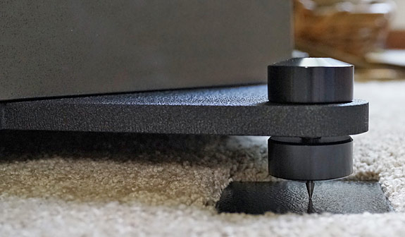 Next up were the loudspeaker footers. The tweeter is already positioned high on the SRC so I didn't want to raise them higher. My go-to footer in such a case is the very affordable Soundeck footers that I've reviewed and recommended over the years, most recently in the 2023 annual Gift Guide. I used a set of the larger 70mm square footers because of the heavy weight of the Acora, but the smaller 50mm round or square are effective with most gear. The improvement in resolution was way more than worth the modest price, especially in the context of a speaker as expensive as the Acora. Plus, it will protect your floor or carpet, though special floor protectors are included with the speaker, as I've said.