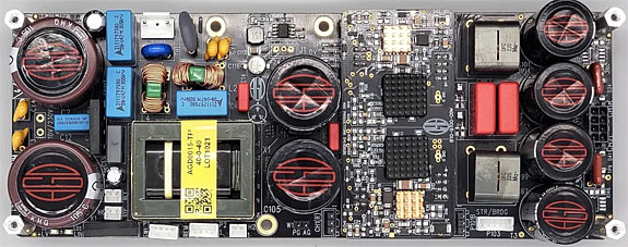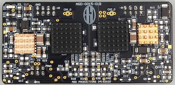 About AGD's Tempo di GaN Stereo Amplifier The size was impressive, too. I kept thinking "jewel case" as if it were filled with expensive gemstones. The polished aluminum chassis obviously contributes to the allusion. It is way smaller than a typical Class A or Class A/B amplifier. Class D simply does not have to be that large. In opening another manufacturer's Class D amp some years ago, the famous advertising cliché came out of my mouth: "Where's the beef?" The billet chassis of the Tempo contributes to the heft, but I was quite certain the contents are fairly compact to keep the signal paths short. I was reluctant to open the amp to photograph the internals, but a couple of photos on their website give you the general idea of the complexity and density of their PC boards which are said to be state-of-the-art. Alberto supplied the photo below to show the circuit boards in relation to the size of the chassis. There is not a lot of wasted floor space inside.