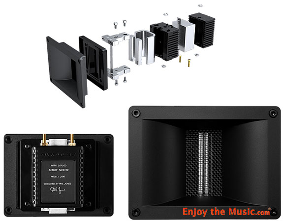 The tweeter assembly features a new ribbon design that is 3" tall and horn loaded with phase correction to keep the high frequencies directional and coherent at the listening position. Phil believe that this produces the ideal dispersion pattern; sound that is focused over a broad listening area with enough "throw" to actually reach your ears coherently. More direct sound of the recording reaches the listening position without interference from undesirable room reflections. The result is a cleaner sound with a more realistic stereo imaging per the recording. Ok, so we have the speakers, but what about all the other goodies?