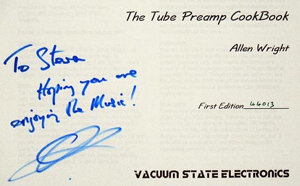 Allen also sent me a brochure of his then-new 1987 products (pictured above) that includes his Four Value Series and Realtime Series. And I quote, "The Vacuum State Four range is based on the concept that simple, well-engineered tube circuitry can provide you with a more enjoyable musical reproduction than possible from complex, costlier solid-state equipment," The Realtime Series part of the brochure says, "The Realtime Series components do not need negative feedback because their innovative tube circuit are inherently linear and have a very wide natural frequency response. Accordingly the single passes through, entirely free of blurring time-smear and transient abbreviations that can have such degrading consequences when negative feedback is used; instead the amplification is being performed in 'real time'." If you have a First Edition of Allen Wright's The Tube Preamplifier CookBook with a grayish brown cover sheet that has a B&W photo and black plastic binding (as seen below) you have one of the books I personally had manufactured and distributed back in the day. For you history buffs, below is the very first edition with white metal binding as Allen had made in Germany, then there is a middle version, and the lowermost version is the one I had produced. Below that is a copy of the book Allen personally signed for me, and note he says "Hoping you are enjoying the music, as the tag line "Enjoy the Music" I had already long established online on CompuServe's CE Audio discussion board.