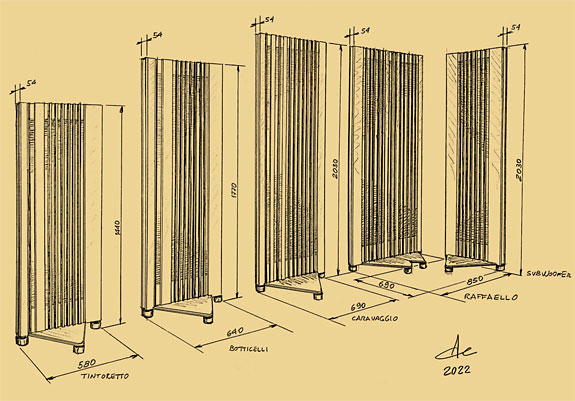 All models feature robust heavy-gauge steel frames and employ a variety of other materials like acrylic plastic, PVC, and precious solid teak wood, all chosen for their vibration-damping behavior. The entire completed panel rests on custom damping feet, also manufactured by Alsyvox. And while the standard finish is black glossy acrylic with natural teak profile inserts, other colors and finishes are available upon request. There are currently four models offered, all of which feature acoustic panels that work entirely with dipolar ribbon speakers, the Tintoretto, the Botticelli, the Caravaggio, and the Raffaello.