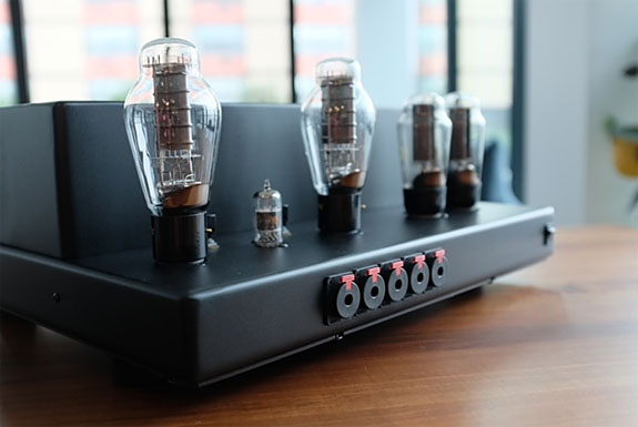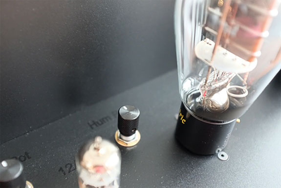 On top of the amplifier you will also see two knobs; these knobs are called hum pots. Direct heated triodes like the 300B can hum if the AC noise is not canceled. The hum pot allows for a fine adjustment to ensure you cancel as much noise as possible. In theory this adjustment is tube dependent however, most of the time it's power dependent. Once set it is likely that it will not have to be changed unless you change the power that the amplifier is connected to (for example, moving it to another home/room or connecting a new power conditioner in front of it). The Red October employs zero (or no) feedback. Many people who love single ended amplifiers love the sound of zero feedback since it has a purity to it. I personally agree and love the sound of a zero feedback amplifier when well executed. We will talk more about this below.