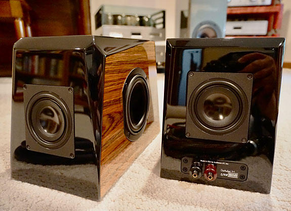 Specific to the most recent 1+1 V5, I paraphrase Audience's website introduction: "The 1+1 is the most unique small footprint loudspeaker in the world. It features a wideband driver eliminating the need for desparate drivers and crossovers. The 1+1 V5 measures flat from 55Hz up to 22Khz without the use of a dedicated tweeter and associated crossover. Consequently, transition at the most critical frequency range, from mid to high, is entirely smooth and supremely coherent. The 1+1 V5 is a bi-pole design, which expands the soundstage, extends low frequency, and increases power handling. There are active full range drivers, in-phase, on the front and rear baffles, complemented by passive radiators on each side. The jewel-like enclosure is a joy to look at and will fit into any room where space is at a premium and high-quality sound is desired. The two A3S2-16 drivers employed in the 1+1 V5 are a dual gap motor design with ultra long-throw excursion providing surprising SPL levels with big dynamic range. They are exceptionally resolute at low volumes and will effortlessly deliver the full emotional slam of your most dynamic music."