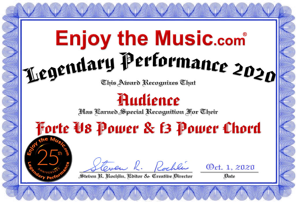 II. Audience forte f3 powerChord On the other hand, sometimes differences that aren't improvements in an obvious or uncontestable way, need not be mere differences. An audio system is a system. The sound it produces is the sound of the system as a whole. The sound the system as a whole is, in turn, a function not just of the characteristic attributes of its parts, but of how the parts interact with one another. It should not be surprising then that changing out anything from capacitors to power chords and cables will have an impact on how a system sounds. Therefore, there will almost always be differences to hear, but that leaves several questions worth asking: first, how great is the difference, that is, what is the order of magnitude of the change? Second, is the difference in how the system sounds one that you (as an audiophile) would like to experience for some time or over time? Third, if the answer is in the affirmative then what costs are you willing to incur to listen to the system with this change in its voicing? Fourth, does the change make the system better? In the past fifteen years I have had two completely different systems in my home both of which I could have lived with forever, and one of which I lived with for over five years barely making even marginal changes. In case you are wondering, one system was a complete Shindo system from power conditioner to speakers and all stops in between. The other was built around the SoundLab 845 speakers that I reviewed a couple of years ago. I would have had to work with that system for some time to make it perform as best it could, but I knew from the outset that there was a system I could live with lurking. I am downsizing these days and while putting together yet another such system. Is one of these better than the others? I have no idea. I am pretty sure they are all quite different, though they share attributes that characterize what I find most important in any system that I anticipate living with long term. Furthermore, I'm inclined to turn a deaf ear to those who would criticize power chords (or interconnects or cables for that matter) as snake oil. However, I do understand being anxious about how much money to invest say in aftermarket power chords when you are uncertain of how to appreciate the differences they make, and especially if you are worried about whether what you hear are improvements or differences, and so on. It won't help matters if you are not sure whether your system is capable of revealing the fine-grained differences that power chords are likely to make.
