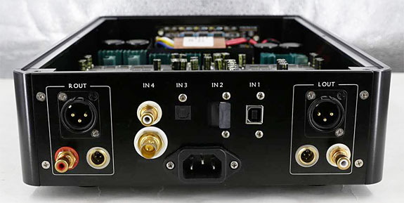 The chassis design, identical to the NFB-1 reviewed earlier, is milled aluminum (black) with rolled corners, long rather than wide (W 240mm X L360mm X H80mm) with a good-sized fluorescent display on the front panel bounded by three push buttons (aluminum) underneath (Setting, Selector Left/Right) and the power button to the left. Like the NFB-1 the rear panel offers a dual mono design with the outputs on the outside and the inputs in the middle. For outputs, you have standard three-pin XLR Balanced, RCA Single-Ended, and three-pin mini-XLR CAST (Current (Mode) Audio Signal Transmission ) ACSS. (Note: when looking from the rear, left and right are reversed, the same is true for the NFB-1, this is because right and left are oriented for amplifier/speaker configurations which would be aligned from the front.) To the right of the Right Input is the Update Port (using a ten-pin connector, not in the below image), IN4 (RCA & BNC SPDIF), IN3 (TosLink optical S/PDIF), IN2 (HDMI), and IN1 (USB), with the power socket in the center under the inputs.