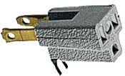 usually gray and they attach to the male part of an electrical cord. They convert a three prong AC plug into a two prong AC plug