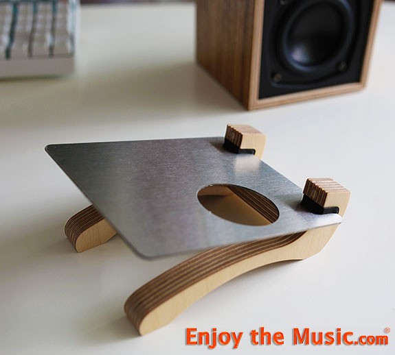 Here is where sensible engineering comes in; the steel plate sandwiches acrylic film to become a damped constrained layer. The plate sandwich is then clamped by a thick layer of neoprene on the frame. Both work to suspend the speaker so it isolates them from harmful and undesirable vibrations. Curiously, the plate has a 2" hole. It turns out the speaker's bass port is downward firing and sits over this. The bass port was not spared from receiving ye ol' quality treatment. It would appear the ports are made of copper! How uncommon. The feet design is quite clever in that it isolates things to improve sound. Thus you may angle them to suit desktop use plus it ensures clearance for the port. Ingenious!