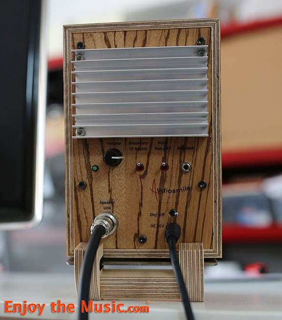 A large SMPS power supply feeds the LBM connected via a DC cable to the left master speaker. The master speaker controls volume, selects between Aux 3.5mm stereo plug or Bluetooth plus there is a boundary switch. A sturdy four-pole cable connects between the master speaker that has all the active electronics to the right slave speaker to carrying speaker level connections to the tweeter and mid-woofer. The master speaker's boundary switch turns on a -2.5dB shelf to the bass driver, should the LBM be placed near walls or corners. This was left off during reviewing as desktop speakers and turned on when tested in the living room. So let's dig into the details shall we?
