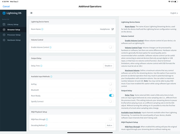 Switching to Roon; Roon immediately discovered the Aries G1, and all I had to do was enable it. Roon also properly auto discovered the right setting for the connected Chord M Scaler. Once set up, I chose a song and pressed play, and the album artwork lit up on the Aries G1's display. Setup really was that easy, and I could not help but laugh a little bit at just how polished the setup process was compared to some of the other competitors out there. Switching back to Lightning DS on the iPad, I linked my Qobuz, Tidal, and Spotify accounts, and checked to make sure I could stream from each of them. I also enabled airplay, and tested airplay-ing some content from my phone to the Aries G1. All worked perfectly and as expected.