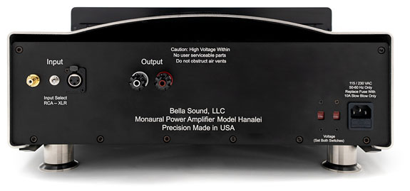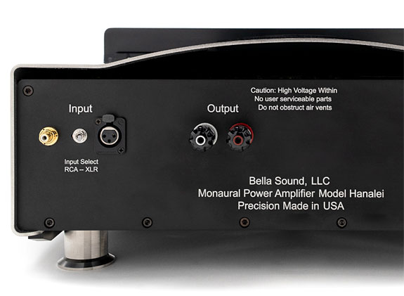 Bella Sound's offices and factory are in Northern California, about 25 miles south of San Francisco. They design and manufacture amplifiers, power conditioners, and AC power cables. The subject of this review is their Hanalei monoblocks, which have an output rating of a substantial 700 Watts into 4 Ohms. Bella Sound offers one other amplifier, their Kahili stereo amplifier, rated at 400 Wpc, not as powerful as the Hanalei monoblocks, but still a considerable amount of power. Both amplifiers that Bella Sound manufactures have enough