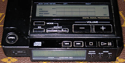 The D-555 also heralded the use of Digital Signal Processing (DSP) in a portable unit. While a big yawner here in 2003, in 1990 DSP was like the Almightly herself came down from heaven to grace the digital realm. While you could only enjoy one DSP effect at a time, you were offered an impressive five bands of digital equalization (63Hz, 250Hz, 1kHz, 4kHz, and 10kHz), or Surround, or Bass Boost, or not-so-glorious DSS (Digital Dynamic Sound). DSS is basically a dynamic compressor so that overall dynamics are more even. This helps boost very quiet passages and makes them louder and, hence, more audible in noisy environments. The point here is that the D-555 had features only dreamed about in 1990 as we must remember that CD appeared to the masses in 1983.  Only 7 years later we have 8-times oversampling and DSP within a portable player!