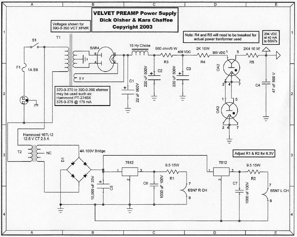 Construction Notes DO NOT attempt to build this project unless you are an experienced kit builder. Tube circuits, and in particular, HV power supplies, present a risk of serious and even deadly electrical shock. If in doubt, solicit the help of an experienced technician. The voltages shown in the power supply schematic refer to a custom deHavilland 390-0-390 power transformer. A good commercial substitute is the Hammond 274BX, which conveniently includes a 5 V/3 A rectifier winding. Check out pricing at Parts Express. Another possibility worth investigating is a vintage transformer. There are tons of old Stancor (and others) combo plate and filament transformers in the 375-0-375 to 395-0-395 realm that can be found on Ebay for $10 to $20. Resistors R3, R4 and R5 will need to be tweaked for the actual transformer used to match the voltages indicated. Kara recommends Chemi-Con electrolytic caps for the power supply, and has found them to be very reliable. These are available at great prices from MCM Electronics. The 4 A/100 v rectifier bridge and 7812 +12V regulators used in the 6SN7 filament supply require heat sinking. R1 and R2 serve as current limiters during turn-on to protect the 6SN7 filaments from excessive in-rush current. Their voltage drop may need to be tweaked from the value indicated in the schematic to obtain 6.3 VDC.