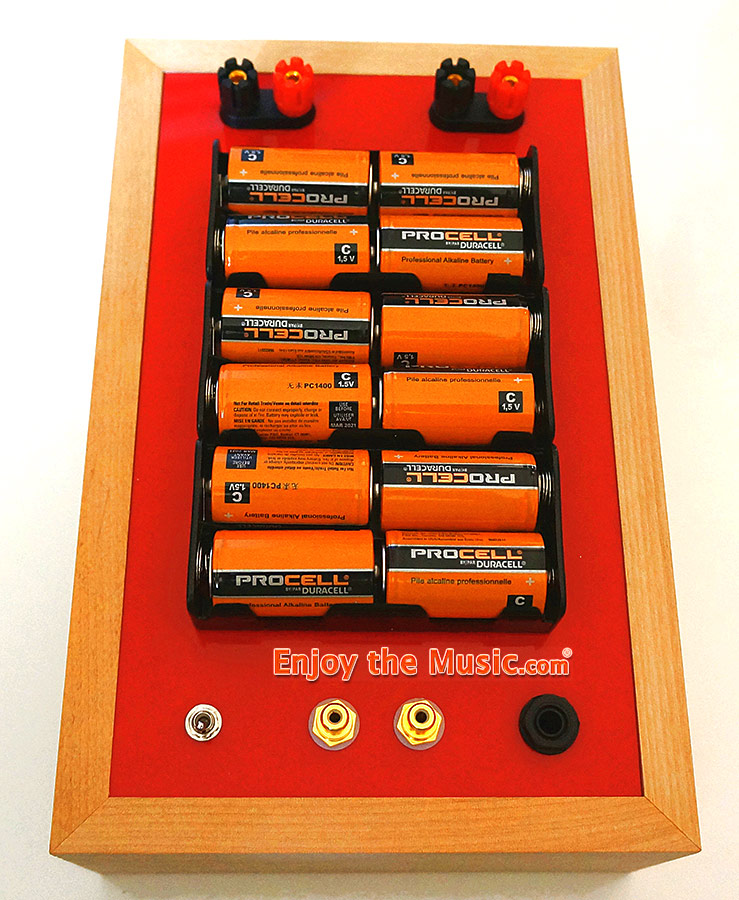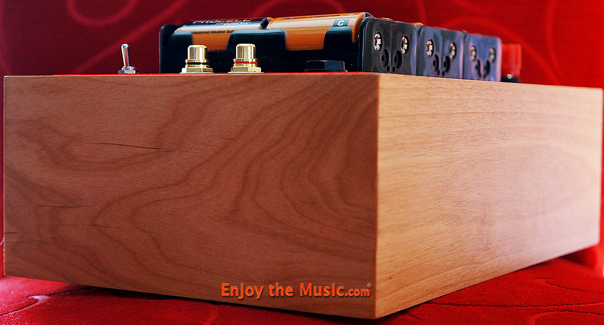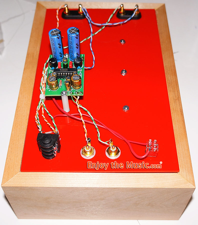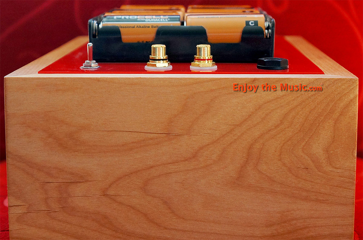 I recently reviewed the Bottlehead Quickie linestage, which is a great value and a lot of fun. Along with the Quickie, I also built the Bottlehead Quicksand amplifier. This amp is similarly inexpensive at $119 versus the Quickie at $99. Wooden bases are $40, putting a "full" Quicksand at $159 if ordered separately ($169 for the Quickie 1.1 with base and PJCCS upgrade). The Quickie and Quicksand are currently also sold as a combo deal with a $20 discount, giving a battery powered hi-fi system, with bases and CCS, for just over $300. Pretty good deal for interesting, portable separates. The amp is built upon the same acrylic top plate/wooden base construction as the Quickie, with one of the quirks being that the top plate comes in any color you want- so long as the color they ship is what you wanted (IOW, it's random). Mine happened to come in red, matching the Quickie, and I quite like the look of it. The massive bank of 12 C-cell batteries gives the chassis plenty of heft, and the controls are minimal giving the amp a very unique look. The front of the chassis has a power switch, gold plated input RCAs and headphone jack, with the good quality but generic binding posts occupying the back side of the chassis, with the middle of the amp dominated by the bank of batteries. Not surprisingly, the Quicksand is a low powered amplifier, and uses Class D integrated amplifier technology from Texas Instruments. The IC is the TPA 3122 chip which generates 4/8 Watts per channel into 8 and 4 Ohms respectively (a normal doubling of power into the lower impedance due to the doubled current required). Battery life will vary widely with power output requirement, ranging from 5 to 300 hours, per Bottlehead. The circuit board is very compact and packed tightly with good quality components, and there is a boatload of room under the chassis for any modifications one might desire.