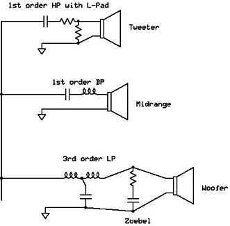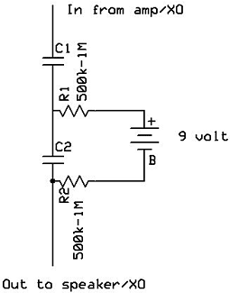 The execution is rather simple from a circuitry standpoint; each terminal uses a resistor of highish value to one spot on either side of a capacitor plus a second capacitor is in series with the first. The capacitance (uF) values of these capacitors are twice that of a non-charge-coupled single, unless you use dissimilar values, in which case you'll need to use (1/C1)+1/(C2)=1/C, where C1 and C2 are the capacitors used and C is the total capacitor value. So take for example a 5uF capacitor. You could replace it with two 10uF in series and still have 5uF, or you could have a 50uF in series with a 5.5uF capacitor and also wind up with approximately 5uF. The resistor values are high, as the only action the battery is performing is to provide a charge to the capacitors, which will only require trickle current to maintain, once they're charged. The resistors help ensure that you don't wind up accidentally sticking DC on your driver (a very bad thing). JBL used one resistor, I'm paranoid so I used two. Though one is sufficient and that can go between either terminal and either side of the capacitor- the critical part is that in the middle of the two caps, you have a voltage (9V is most common). I can build that but why would I want to? You'd want to because it is claimed to address the two largest problems of capacitors in audio circuits -- dielectric absorption and mechanical resonance/microphony. Dielectric absorption is exactly what it sounds like. A capacitor in simplest form is comprised of conductive plates with an insulator between them. The field created by AC can pass between the plates as the electrical field exists in the space around the conductor, but the DC cannot pass over the insulator, as it does not create the field to pass across the insulation barrier. The capacitance value is determined by the area and distance between these plates. A thicker, more voltage resistant capacitor usually relies upon a thicker layer, so higher voltage capacitors tend to grow rather quickly in size compared to their lower voltage counterparts. Dielectric absorption is when this insulation layer absorbs some of the AC energy passing across it (some DC can also be absorbed), and can later re-release it. This phenomenon shows itself most at the "Zero crossing", where the voltage across the capacitor passes through 0V on its way from positive voltage to negative, or vice versa. Music has this happen all the time, but a static DC bias pushes the voltage across the plates (conductors) of the capacitor away from this zero crossing. In the 9V case, you would then need a +/- 9V audio signal to ever encounter the zero crossing (that's 18V). That's EXTREMELY loud with almost any loudspeaker, if it's frequently encountering that. If you were running up to 18V often, you could always add more batteries and thus voltage. Additionally, we're very sensitive to zero-crossing phenomena, like "crossover distortion" in amplifiers, or stored energy in a loudspeaker suspension. Now, you needn't have 18V RMS to encounter the zero crossing, music can be highly dynamic and give peaks far above the average level. But, fortunately for us, minor distortions at these peaks are masked, not only by the loudness of the sound, but also by other distortions associated with large peaks and displacements. If you're concerned about high peak outputs encountering the zero crossing of the capacitor, you can up the voltage with multiple batteries in series (or a higher voltage supply). By removing the zero crossing, we get a capacitor that mimics one with a much thinner or higher quality dielectric. This leads to a lack of listening fatigue, or at least that's what my ears tell me about charge-coupling. I'm going to assume that the "smearing" effect I've noted is more related to mechanical resonance. Mechanical resonance is an issue, if you change the spacing of the plates, the characteristics of a signal passing between them would also change, providing modulation of the capacitor value and overlaying the characteristic resonances onto the signal. Applying a voltage is claimed to create a tensioning effect on the windings of a capacitor, holding it in place and suppressing vibration behavior- just as a capacitor with better quality windings, and heavier-duty construction might. Isn't it a lot of effort for a little thing?! It's a simple project, and there's a significant gain to be had- You can build a higher-end capacitor than you can afford by simply using quality inexpensive caps and charge coupling them. Commercial Mylar and poly caps are available very inexpensively from surplus houses like Apexjr and Madisound seems to have an endless supply of handy little 10uF yellow caps on their clearance page. Sure you need to buy twice as much, but if you shop carefully, you can come in quite a bit less expensive than even the cheapest "audio grade" cap from Solen, Erse, Clarity Caps, or whomever. So not only can you make a capacitor that will significantly outperform most models, you can do it in values that aren't necessarily available and would be extremely expensive. At the time of this writing, a single, not terribly good sounding, Solen Fastcap of 40uF is going for $16.28 at Parts Express. That's what it cost me to build a pair of superior audio capacitors with charge-coupling. So a 50% savings and better sound. Not too shabby! There are a lot of locations for capacitors within a speaker crossover. Other locations in most systems are less appropriate as they're usually already biased with DC and the components are using them as DC blocking capacitors rather than AC filters, so in those cases they're effectively already charge-coupled. Below is a typical, simple crossover three way speaker – there are four caps in there! You can share a single supply/battery between all of them, since they're isolated by resistors.