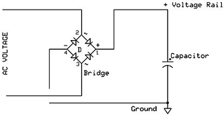 I'm going to make an assumption here- your system is compromised by your capacitors. Yep, it's true! Some people go to great extremes to avoid caps in their rig, but they're darned near unavoidable. A typical hi-fi will have as many as a dozen of these reactive little weasels in the “signal path”, wreaking havoc with your wonderful sound. In efforts to minimize the damage, audiophiles have been inserting better/different capacitors into their equipment for decades. There are capacitors out there (some very nice sounding) that cost literally thousands of dollars. See Duelund and Audio Note if you doubt me. What exactly is a capacitor, and what does it do? A capacitor has two primary functions in audio equipment. One is as energy storage. Capacitors can be thought of as rechargeable batteries, being able to store significant amounts of energy at whatever required voltage you need- assuming the capacitor is designed for that voltage rating. Batteries are limited chemically by the operation of the cells, where capacitors can operate over a large range of voltages. Additionally, a capacitor is a high pass filter and increases it's impedance at low frequencies, with the specifics depending upon the values of the capacitor and circuit details. This is desirable within the power supply application as they provide a path for unwanted Alternating Current (AC) to shunt to ground while passing the Direct Current (DC) to the circuit and providing energy storage for said DC. Below is a basic power supply schematic showing a typical reservoir/filtering capacitor used for both these purposes.
