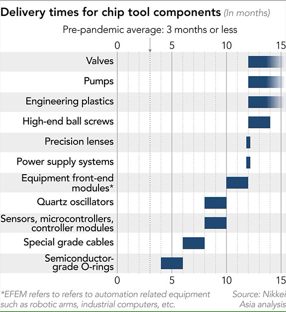 Is 18-Months, What about now? Chip manufacturers say the delays are the worst they've seen in decades. For example, testing gear from KLA (a U.S. company) has a current wait time of "more than 20 months." Equipment used in making substrates – material that carries chips prior to being mounted in PC boards – is experiencing wait times "up to 30 months."