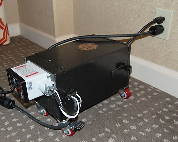 Once I lugged the EI 30A out of my car and into my living room, I was able to get a good look at it. The heart of the EI 30A is an E-I 30-amp stacked lamination transformer. This is the part that converts the normal 120 VAC to a balanced 60-60 VAC. There are industrial-grade plugs attached to heavy-duty power cords for input and output. For safety reasons, Marshall added a Line Guard installed in line with both balanced output phases – a 30A dual GFCI (ground fault current interrupter) protector. If there is any current imbalance between the two balanced power pins (ie, a fault in a piece of equipment or a power cord), the GFCI trips immediately to both phases and stops power from the main power cord. Then it must be manually reset via the front of the Line Guard GFCI.