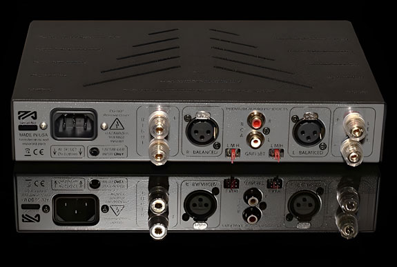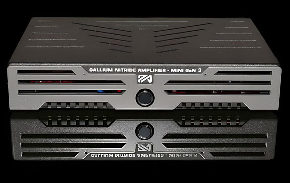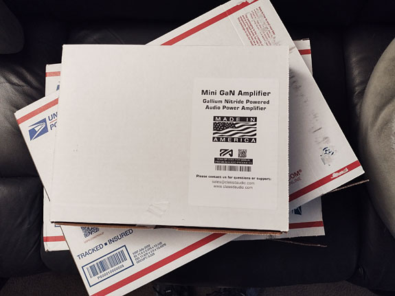 As it turned out, inside that box was a smaller USPS box, and inside that was the actual box for the amp. The Mini GaN 3 is the most diminutive amplifier I've ever had in my system. It measures 9.75" wide, 7.5" deep, 2" tall, and weighs only 5 lbs. Despite its small size, it delivers 150 Watts per channel (Wpc) into an 8 Ohm load and 225 Wpc into a 4 Ohm load. It also has a bunch of nice features. It provides both balanced XLR and unbalanced RCA inputs. The loudspeaker terminals are five-way plated copper speaker binding posts. There is a 12-Volt trigger input to sync it with a preamp. There are even jumpers to adjust the gain: low (26 dB), medium (28 dB), and high (32 dB). The low-gain setting worked the best with the high-efficiency speakers in my system. There is an IEC connection and a provided power cord. A push button in front controls the power and blue ring lights around it when on. The amp is enclosed in a well-ventilated sturdy steel case with a powder-gray finish. When you turn the Mini GaN 3 on, two red LEDs illuminate on the front panel. They stay on for about three seconds and keep the amp muted. After about three seconds, the red LEDs go off, the mute is disabled and the amp is running. Once stabilized, two blue LEDs come on for each channel. Every part of the Mini GaN 3 exudes quality.