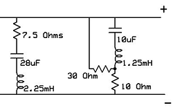 As you can see, there are three individual impedance spikes, two of which are fairly severe. A "textbook" first order crossover would never work with these, and thus the impedance needs significant correction. The correction for a spike, as opposed to a gradual rise like voicecoil inductance, requires a notch filter. This is what's called a tuned circuit as the reactance of the capacitor and inductor effectively enhance each other. For impedance correction it's typical to see an inductor, a capacitor, and a resistor in series with each other, and in parallel with the speaker load. Values are calculated to match the frequencies and Q of the impedance spikes. The effect will be greatest (peak or dip depending on arrangement) at the frequency where the reactance of the capacitor and the inductor are equal. Damping resistors are used in most notch filters to ensure that the spike or dip is of appropriate size. Here you see a pair of notch filters tuned to the impedance spikes of the 2426h.