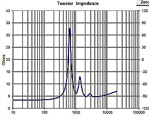 This takes care of the top end rise in the woofer impedance from the voicecoil inductance, but reveals another problem- our 8 Ohm woofer… isn't. It's more like 5 to 6 Ohms (this is typical, the valley above the Fs peak is usually only slightly higher than the DCR of a driver). So we need to now adjust our inductor value, as we only need about 5.5 ohms of inductive reactance to achieve a 6dB reduction in level. Accordingly, we would adjust the value down to about .4mH and we have a correctly implemented first order rolloff in the woofer IF the woofer is extremely flat and extended in terms of frequency response. The driver whose impedance is shown is fairly flat and smooth to about 5 kHz (JBL 2213), but your typical 12" will have major frequency response variations much lower in frequency. Even 8"s usually don't cleanly reach that high. That said, so long as the rolloff of the woofer is fairly clean you can usually use a "first" order crossover per the above and achieve good results. When examining an impedance curve we still see one other obtrusive feature- the impedance spike at Fs. This is the resonance of the driver in question. Not a major issue for the woofer since you're not trying to apply a high-pass function, so it's not within the crossover operating band. However for a tweeter, or a midrange, this is a significant problem. Most are tuned to keep this impedance rise fairly low, like in the Dayton ND20FB-4 (note the frequency scale, the Fs is at 2 kHz)
