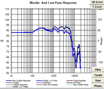 You can see that it's not even close to flat. The nominal calculated values for the crossover are now working against a complex load. The inductor placed in series adds 8 ohms to the impedance at 2 kHz, but the impedance is actually 10 ohms at this frequency, so it's slightly less than a 6dB reduction. Further, the Le (voicecoil inductance) of the woofer creates the same sort of rise the inductor does. This means that when the inductive reactance of the coil doubles, the impedance it's working against has also increased. Between 2 kHz and 4 kHz the coil goes from 8 to 16 Ohms, but the driver is also rising, from 10 to 15 Ohms. So you see a much smaller relative change in output. You get slightly less than 6dB of attenuation at 2 kHz, and slightly more than 6dB at 4 kHz. The idea was to get 6dB at 2 kHz and 12dB at 4 kHz however! And it goes beyond that- you can see that in this (typical) woofer the doubling of inductor reactance with frequency is matched with the Le of the woofer, so you'll never have an increase in dB attenuation above the "slightly over 6 dB" number. Matters only get worse when you go lower than our 2 kHz nominal point- you see that the attenuation takes place earlier than you'd like since the woofer impedance is dropping with decreasing frequency, so the series reactance from the coil also isn't ideal lower.
