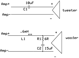 Impedance Example via a dose of humble pie for the first order aficionado Your typical super-budget crossover is comprised of a capacitor on the tweeter and an inductor (coil) on the woofer. This is not uncommon even at the high end of audio, though the success of such a scheme is largely dependent upon the drivers used. You can get away with a cap 'n coil crossover in some instances, but by and large they're not worth using. This type of crossover is often called a "first order" crossover, referring to a 6dB/octave slope of the cutoff. This means that above the cutoff point, the woofer's response will decrease by a factor of 6dB for every octave the frequency increases, and likewise the tweeter will decrease by 6dB per octave below the cutoff for each octave the frequency decreases. The phase is shifted to +/- 90 degrees depending on whether you're talking about a capacitor or a tweeter in series with the driver, and the impedance is increased the more the SPL is reduced (the SPL reduction comes from the voltage and current reductions of the increased impedance of the system). Sometimes these crossovers utilize no inductor on the woofer, relying upon the natural rolloff and voicecoil inductance of the woofer to accomplish the cut of the high frequencies