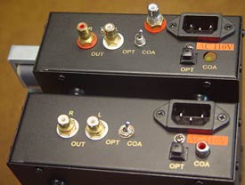 The DAC-Ah will win no prizes for industrial design. The rectangular black metal box is as basic and you can get, with just one control up front, the power switch and a small blue indicator light above it. There's a single control at the rear too, a toggle switch to select the input — either Toslink or Coaxial. You will also find the 110V AC power input, the two inputs and the RCA output jacks on the back panel. The Baddymod DAC offers upgraded RCA jacks and an impressive looking coaxial connector, but foregoes the front indicator light.