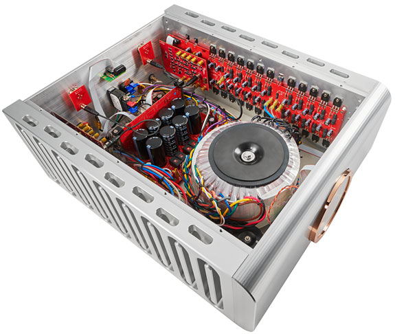 For example, they discuss their "innovative" Super Rail circuitry, where each amplifier uses two voltage rails, a positive and a negative, which support power delivery to the speakers. The music signal passes between the two rails, but to natural loss, and this signal never reaches the amplifier's output rails' full capacity. The D'Agostino amplifier's Super Rail overcomes this limitation by using higher voltage rails in the sections before it reaches the output stage. Boosting the voltage allows the musical signal to "exploit the full capacity of the output voltage rails Having the musical signal swing closer to the output rails "maximizes the performance of the output circuitry design itself." They conclude that this is why this power amplifier's dynamics and distortion rating is improved, and the amp has a "fierce grip" of the speaker. Even on paper, it was evident that D'Agostino went far beyond what is necessary to make a power amplifier sound its best. This amp weighs 115 pounds for a reason, and not just because the innards of its anodized aluminum chassis contain a 2,000VA power supply transformer coupled to nearly 100k microfarads of power supply storage capacitance. Also inside the S350 is a driver stage with 48 transistors split between its right and left channels.