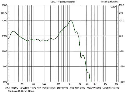 Cast of Characters The Hawthorne Audio Silver Iris Augie Woofer There is more to Kentucky worth writing home about than merely Bourbon and horse racing. I am thinking specifically of Eminence loudspeakers, headquartered in Eminence Kentucky. And that is where Darrel Hawthorne, the progenitor of Hawthorne Audio, turned to for the design and manufacturing of his driver line. The Silver Iris line consists of a 15-inch coaxial and the Augie – a 15-inch woofer intended for OB applications. The Coaxial driver came first. Darrel tells me that following on its success, he wanted to offer a bass augmentation driver that could extend frequency response low enough in an open baffle context to fully enjoy almost any genre of music with minimal compromise. And so he went back to the engineers at Eminence with a wish list in hand to develop the Augie. The Augie is a well-built woofer incorporating Pro features such as a cast basket, a Kevlar reinforced paper cone, a long-excursion poly/cotton cloth surround, a vented 2.5-inch voice coil, and a copper shorting ring. Power handling is said to be 225 watts RMS. Three parameters are essential for ideal performance in an open baffle: a high driver total Q (Qt), a low free-air resonance frequency, and a generous excursion capability. The Augie delivers on all three counts. Maximum cone excursion is a very decent 7 mm. Free-air resonance is 27Hz, and the Qt is 0.92. The latter parameter gives the dipole woofer "wiggle room" to compensate for the baffle step decrease of 6 dB per octave down to its resonance frequency. The ideal Qt for OB applications is somewhat debatable, with some designers favoring a value around 1.0. Bob Carver's 'Amazing' loudspeaker comes to mind as an extreme example. The speaker, when it was under review in Stereophile's listening room, featured a line array of inexpensive dipole woofers whose chief claim to infamy was a Qt of about 1.2. While bass extension was commendable, the quality of the bass was less desirable. Carver himself characterized the bass quality as "rolling" and claimed that he preferred it that way. To my ears, the bass was simply ill-defined, the opposite of tight; the wrong compromise in my book – quantity over quality. Dipole bass confers certain advantages such as freedom from boxy resonances, but attention to proper damping is still an issue as it is with conventional box woofers. There is, unfortunately, no free lunch. Increasing a woofer's Qt is accomplished by scaling back the size of the magnet, which reduces sensitivity. The only way to maintain both a high sensitivity and a high Qt is to increase the woofer's resonance frequency. Thus, a woofer with a high Qt and a low resonance frequency offers at best only medium sensitivity. It is not surprising therefore that the Augie's sensitivity is only about 89dB. Measured in the VISATON baffle, the Augie produced impressive low-frequency extension. The following Figure shows its near-field response which is extended clear down to the resonance frequency of 27Hz. Very impressive extension indeed!
