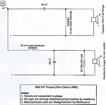 Driver Integration The task of blending these two fine drivers was guided by the KISS principle – Keep It Simple, Stupid – at least as simple as was possible taking the drivers' needs into account. My goal was to maintain a full-bodied balance through the upper bass transition region without impacting bass or midrange resolution, and as it turned out, that necessitated the use of second order crossover networks. That may disappoint some purists, but I did try the first order approach and was not satisfied with the results. The final network (shown below) makes me very happy and I believe coaxes the best sound possible out of the driver complement in the context of the VISATON OB.