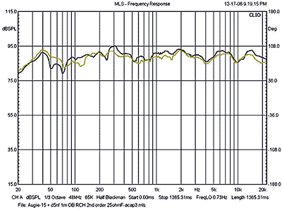 Parts quality is a major factor in a speaker of this caliber. The caps selected for this project were the auricap metalized polypropylene type by Audience. For starters, this cap is extremely well built, and most importantly, my listening tests showed a clear preference for the auricap over the Solen Fastcap. In general, the auricap appears to introduce less fuzz into the signal chain relative to the average metalized poly cap. Its sound could be best characterized as smooth, yet detailed, with excellent transient clarity. The critical 48 μF cap in series with the D5nf was built up from three lower value caps: 30 + 15 +3. For the last measure of high-frequency purity, I bypassed these caps with a 0.01 μF Teflon film cap by Relcap. Some of you may have noticed by now the discrepancy in sensitivity between the Augie woofer and the D5nf (89dB versus about 97dB) and must be wondering how is it possible to match these drivers without padding down the Feastrex full range? The answer lies partly in the subtlety inherent in the definition of sensitivity, which is not referenced to an actual watt at 1 meter, but rather to 2.83 V across the terminals of the loudspeaker. For an 8-Ohm load, that translates into 1 watt of power sunk into the load. However, in the OB2's driver transition region, the Augie's impedance is about 6 Ohms while that of the D5nf is 16 Ohms. For 2.83 V across the OB2's input terminals, the Augie is dissipating 1.33 watts to the D5nf's 0.5 watts. The power ratio amounts to about 8.5dB and means that the Augie is working that much harder to keep up with the D5nf. Add 8.5dB to the Augie's nominal sensitivity and you end up with 97.5dB. The proof is in the measured frequency response, which is shown below. These are in-room measurements (with the EAR 834T amplifier) at 1 meter for both the right and left channels.