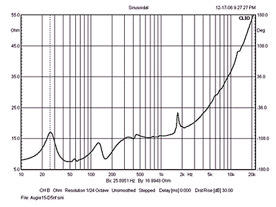 I suspect that the ideal open baffle Qt may well be in the range of 0.6 to 0.7, as I found it necessary to slightly damp the bass range by shunting the woofer with a 25 Ohm resistor. Tuning the bass damping may well be a function of the room and personal preference, but I can report that when tweaked as described above and driven with the EAR 834T integrated amplifier, both bass impact and pitch definition were superb. It seems to me that many listeners confuse bass weight with bass extension and opt for a subwoofer when bass weight is lacking. The problem typically lies in the upper bass, the octave from 120Hz to 240Hz where much of an orchestra's foundation and acoustic power resides. This is the octave that box woofers have a hard time coping with, basically managing to sound boxy through this range. In contrast, the Augie managed to shine here, elucidating instrumental fundamentals with consummate clarity and 3D realism. The Augie's performance was so open-baffle friendly that I decided to use it as a foundation for several full range drivers. The OB2 finds the Augie mated with the fantastic Feastrex D5nf. Future projects will feature the Lowther DX55 and C55, as well as the new Jordan JXr 6HD module.