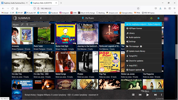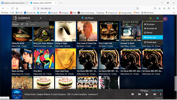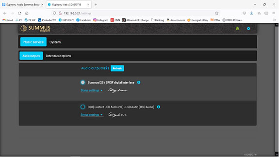 When you get to the Server main page, click on the settings wheel, and click the tab for "Audio Systems." This will take you to a page that allows you to select from seven audio playback modes, including options for Euphony's own Stylus (my personal choice), as well as options for use with combinations of Roon, Stylus, and HQ Player, as well as Apple's AirPlay. There's an information button on each Audio System choice that will help guide you to select what's good for your particular system, or you may want to play about with your choices. It's all fairly intuitive, but may require a bit of experimentation to find what you feel is the correct choice for your particular setup. There are also tabs found within the settings menu that will allow you to make additional system settings, library settings, file management settings, as well the option to view hardware parameters (like system core temps, etc.). And tabs to find operational manuals, to check for system updates, and to find a support library, or reach out for an actual human, should you need one. Even though Euphony is in Croatia, in the EU, and I'm in the eastern United States (a seven-hour time difference) the support people tend to respond fairly quickly if you happen to get stuck on something. Again, most of these tabs are fairly intuitive in action, although I will confess to needing help from the Euphony support team from time to time. Right beside the Settings wheel, there's also a "power" button with options to either shutdown, reboot or restart the device, and also to reload the page. I have often found that restarting the device or reloading the page will fix minor problems with playback or the failure of recent file additions to appear in the GUI. One additional consideration needs to be made when setting up the Summus Server: both the Server and the Endpoint units contain the same hardware configurations that would allow either unit to essentially serve in either capacity. For example, you might want to start out with the Server in a single-unit streaming configuration, and later upgrade by adding the Endpoint — the Server will work perfectly as such. That said, the hardware complement of each unit has been optimized to allow the Server and Endpoint units to individually function at maximum processing efficiency in a dual-computer setup. In a Server/Endpoint system, if you're using one of the Roon modes, for example, in the Server settings menu, under the "Audio Outputs" tab, no choices will be available. The "Audio Output" you're choosing for playback is determined by your selection in the settings menu of the Endpoint unit. However, if you're using Euphony's Stylus "Audio System" (my preference) as your player, you'll need to choose the same "Audio Output" in the settings menu for both the Server and Endpoint units. This will avoid any playback issues you might otherwise encounter should the Server "Audio Output" setting default to something other than what you've chosen for the Endpoint.