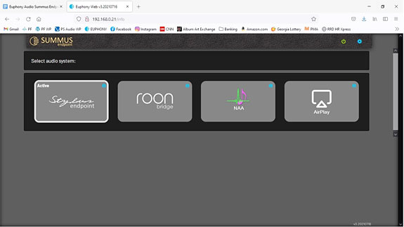 At this point, everything seemed ready to make the connection to Roon, but one element in the process had completely evaded me at the time of the arrival of the Summus Endpoint. I'd had many conversations with Dalibor over his compatibility design goals, but for some reason, it never became perfectly clear to me that the Summus Server came supplied with a Roon Core built into it. My system Roon Core was located in my PC laptop, and I used a hard-wired connection to my network to manage Roon and my library. In my initial attempts to set up the Server/Endpoint combination, I couldn't get Roon to recognize or play any of my music library over the Endpoint. I found this very frustrating, and it took a week of coordinated communication between Dalibor and the Euphony support team, trying to solve the problem. Before ZeljkoVranek of Euphony suddenly came to the realization that I was attempting to use my Roon Core, rather than the Roon Core that was already built into the Summus Server. Switching to the Server's Roon Core solved everything, and voila, we had beautiful music. Trust me, I felt like a complete idiot, because I just wasn't getting it, and afterwards, it was so obvious to me what the problem was!