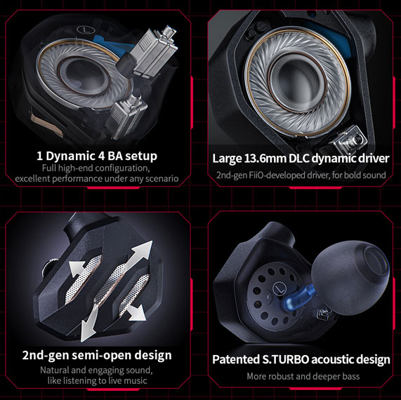 The FH7S housings utilize FiiO's 2nd-gen semi-open design with a Sci-Fi armor look, featuring FiiO's patented S.Turbo acoustic design to precisely control bass and a Unique acoustic notch filter to reduce unwanted sibilance.