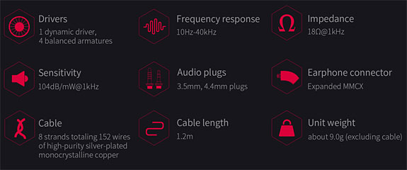 The FH7S is a five-driver hybrid IEM featuring one 13.6mm dynamic driver employing a diamond-like carbon diaphragm and four custom Knowles balanced armature drivers including DFK midrange drivers, which consist of two BAs joined together in a resonance canceling configuration.