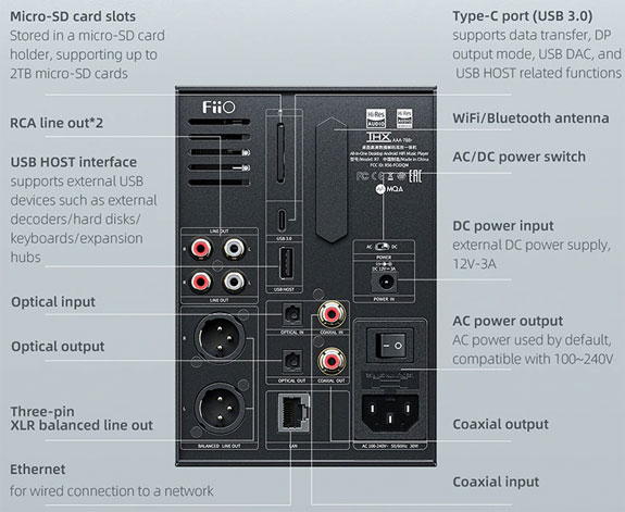 Virtually every modern music lover streams music, this is a given in 2023. The new FiiO R7 provides a staggering array of flexibility. Digital inputs include Ethernet / NAS, SD card, USB-C, USB-A, optical TosLink, coax RCA S/PDIF, and dual-band wireless Wi-Fi plus Bluetooth. Digital outputs are TosLink optical, coax RCA S/PDIF, and Bluetooth 5.0 that supports LDAC / SBC / AAC while analog outputs are two stereo sets of unbalanced RCA and a set of right / left XLR true balanced. Yes, the analog balanced output is exactly that, a truly balanced XLR output as is found within all professional audio gear. Headphone and in-ear monitor lovers will rejoice as 4.4mm and four-pin XLR balanced outputs are right up front, as is a longtime standard 1/4" stereo headphone jack. For fans of Roon, you'll be happy to hear the FiiO R7 will work seamlessly. In addition, for DP output a Type-C cable can connect the R7 to a display with DP input, or you can choose a DP-HDMI adapter cable to send the video to your HDMI video monitor / home theater system. In addition, a mouse and keyboard can also be hooked into the FiiO R7 so it becomes a standalone Android-based computer system.