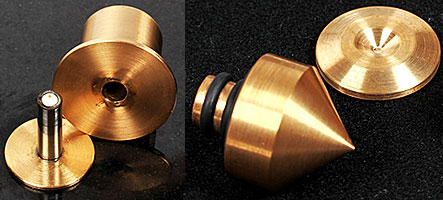 Vibration Control: Three brass cones for isolation. The power unit is fully separated from the turntables base.