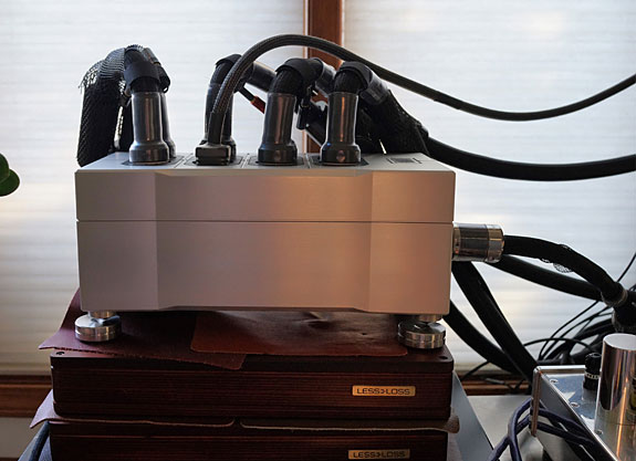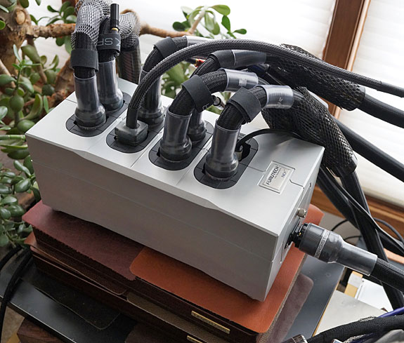 I installed them, intending to listen to a few cuts on my compilation CD, and ended up listening to music for the entire afternoon. They made a significant improvement. In the photo below you see I have the Power Vault resting on top of the LessLoss Blackground for Speakers as this location allowed for quick and easy switching of power cords. More likely, you will place it on the floor near your rack. The heavy weight of the unit facilitated the insertion and removal of the power cords.