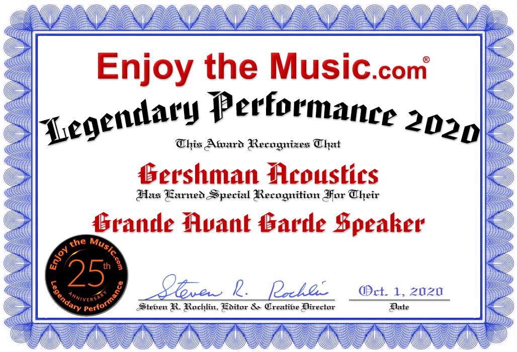 Overall Impressions I am fortunate to have a nice-sized apartment by New York standards, one where my large Ars Aures speakers can fit without much trouble. If I were in a smaller place, I would get the Gershman Acoustics Grande Avant Gardes in a heartbeat. As it was, I was very sorry to see them go. For all the above reasons, the Grande Avant Gardes deserve a serious audition by anyone seeking great sound in this price category.