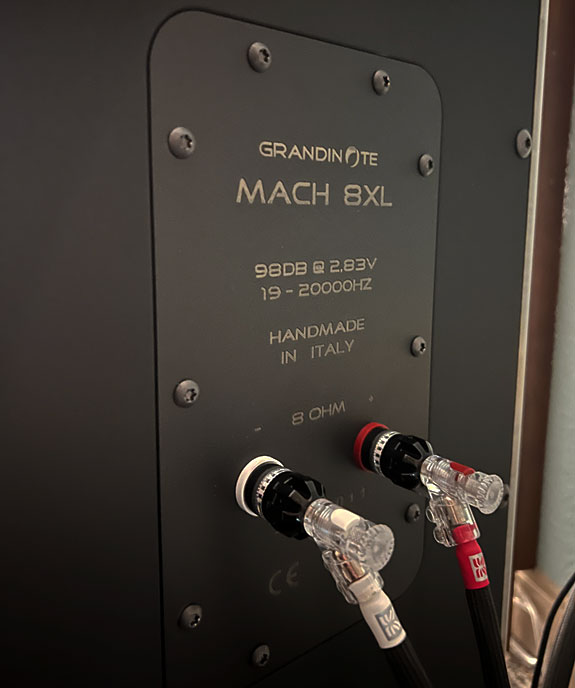 The cabinets were finished with a matte black laminate on the front and back and an attractive and well-implemented grey wood laminate on the sides. They certainly don't have the mass or inertness (is that a word?) of my Rockports, but the cabinets' unique SRT design relies on different qualities to achieve its goals. A single pair of high-quality binding posts on the lower back were easy to use. The speaker was seated on a metal plinth with threaded inserts for spikes. I always try speakers with and without spikes, just to hear the difference. The spikes made a bigger than typical difference in the case of the Mach 8XL. The speaker's SRT design clearly benefits from good isolation. I had lent my IsoAcoustics Gaia footers to a friend, but I would bet (as my mother says) "Dollars to Donuts" that the Gaia's would have made an improvement even beyond the included spikes. For those who own or are considering owning these, keep that in mind to optimize performance. As an aside, they came in well-built and well-padded wooden crates to handle the cross-Atlantic trip drama and damage-free. I was hoping for a nice bottle of Chianti or a fresh pizza, but I think I was being unrealistic in my expectations. I had to settle for delicious speakers. That said, the original plan was to also have their Solo all in one to feed the Mach 8XL, but the audio gods saw to it that didn't happen. Maybe for a future review?.?.?....
