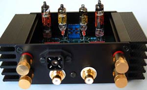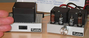 As seen in the photo, the µVac is very small. A puny 140 x 85 x 75 mm for amplifier and 140 x 85 x 90 mm for the external power supply. The box of wooden matches gives you some idea. To the right is a photo i took while covering a European show in 2005. Note the chassis color and Kolibri name at that time. So what is it with the fascination of small chachkies? The heck if i know, other than perhaps i am the type of guy to cheer for the little engine that could. GREATech's µVac is a stereo amplifier with volume control and external power supply. Single source systems can use this as a preamplifier/amplifier, thereby saving money on interconnects and the like. Tube compliment is a High-Rel MIL subminiature beam power pentode 5902 for amplification and high-mu UHF triode 5744 for pre stage. Frequency response is claimed as 25Hz to 30kHz with weight being a mere 2.5 kg in total. The internal power supply senses power voltage and therefore can handle from 115 to 230. So how many watts does this €940, limited production of only 250 pieces produce? Glad you asked! Remember at the beginning of this article where i said the first watt is the most important. Well, that is all you get with the µVac. A single, one, uno, ein.... Just one watt! This amplifier almost personifies the meaning of the first watt, because that is all it can produce. Not that the Song Audio's 4 watts is some big, beefy amplifier in the watt-producing game of life. i mean, here it is 2006 and we have amplifiers that produce well over 1,000 watts per channel. What the heck am i doing playing around with such small wattage units? Ahhh, we must remember the saying about the first watt. As for build quality, the µVac is almost toy-like, yet the tubes are nicely surrounded in an almost jewel-like gloss black chassis.