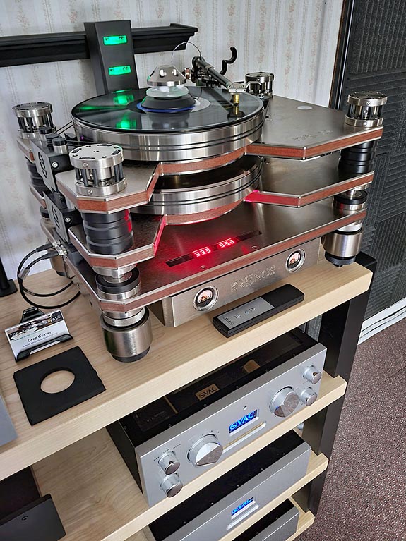 And just like my VSA Endeavor SEs, Greg's ULTRA 9s fire into the room with minimal toe-in, an arrangement that maximizes tweeter dispersion, improves inter-driver phase coherence, and noticeably enhances soundstage scaling and image focus. In the same vein, one look at the Kronos table/arm setup suggests a similar obsessive-compulsive attention to detail. Clusters of Critical Mass Systems component footers sonically decouple source electronics form the resonant-induced vibrational ravages of the listening room environment. Like I said, Dr. Weaver leaves no sonic weirding stones uncovered in his singular alchemical quest for sonic perfection.