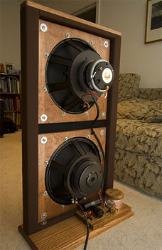 The Sound Of Singing I gave Rage's eponymous debut a spin on the Sterlings to test this. I need not have worried: "Killing in the Name Of" got me rocking so hard I thought I'd break my chair! The visceral impact and rhythmic drive of the 15-inch drivers proved incredibly involving and fun to listen to. There's a reason why muscle-car guys and subwoofer guys share the mantra "there's no replacement for displacement": the effect of having four 15-inch drivers in your listening room is unmistakable. Over the years of life as a budget audiophile I have grown to love the speed & imaging of a good pair of stand-mounted monitors, but the Sterlings have a weightiness in the midrange that I'm not entirely sure I'll be able to live without. Bass reproduction is the Achilles heel of open baffle systems, which suffer an 18db/octave rolloff in the lower frequencies. Hawthorne Audio attacked this problem in the Duets with the Augie (Dick Olsher gave a more thorough write-up than I will be able to do of the Augie in January of 2007), actually two of them, 15-inch bass drivers optimized for open-baffle use. The idea here being that with bass, nothing succeeds like excess! Darrel insists on referring to the Augies as bass drivers, not subwoofers, although bass was more or less flat down to the mid- to high-30s in my room. Upper bass sounded nice and tight: Steve Swallow's solos (who does a lot of high-register activity on the five-string bass) had a good, crisp groove on Carla Bley's hard-swinging arrangement of "Old MacDonald Had A Farm" from her 2003 effort, Looking for America [Watt 31]. Sub-bass was a little soft around the edges; sharp transients didn't come across with quite as much bite as they did an octave up; but it was hefty and impactful nonetheless. The bass drums on Paavo Järvi and the Cincinnati Symphony Orchestra's 2006 recording of Benjamin Britten's Young Person's Guide to the Orchestra [Telarc 80660] shook both the air and my floor.