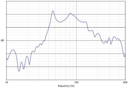 The BRTF I obtained by placing the accelerometer plate on the chair, sitting on it and using ARTA (www.artalabs.hr) to perform the measurement is shown in Figure 3, where the major vertical divisions are 10dB. As you can see, the response is far from flat (and quite different from that typically obtained using large floor-mounted shakers), with what are almost certainly seat structural resonances apparent at about 46Hz and 83Hz, with approximate Qs of 11.5 and 5.2.