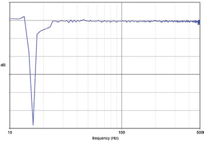So I took a brute force, FIR filter approach instead, making use of Angelo Farina's invert.xfm and convolve.xfm Aurora plugins for version 3 (or earlier) of Adobe's Audition audio editor. The first was used to create the impulse response of the inverse filter, and the second to apply it to the shaker signal. Applying the inverse filter to the BRTF impulse response showed the corrected response to be that shown in Figure 4. Note that the vertical divisions here are just 1dB, and that the response is effectively flat down to below 30Hz, and within +/-0.3dB limits down to 20Hz. The precise processing steps were: 1) Combine the left and right channels into a mono WAV file. 2) Pitch-shift the mono file downwards by an octave, using Audition 3.0's own pitch-shifting tool. 3) Apply the inverse filter to both the mono and pitch-shifted mono files. 4) Apply a 10-order Butterworth low-pass filter to both mono files using Audition's Scientific Filters tool. 5) Assemble two three-channel WAV files using the left, right and shaker signals, with and without pitch-shifting.